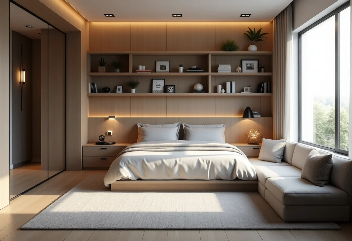 L’éclairage joue un rôle clé dans l’optimisation de l’espace. Les spots encastrés et les lampes à pince sont préférables aux lampes de chevet volumineuses. Privilégiez des textures légères pour les rideaux et les couvertures afin de renforcer l’impression d’espace et de légèreté.